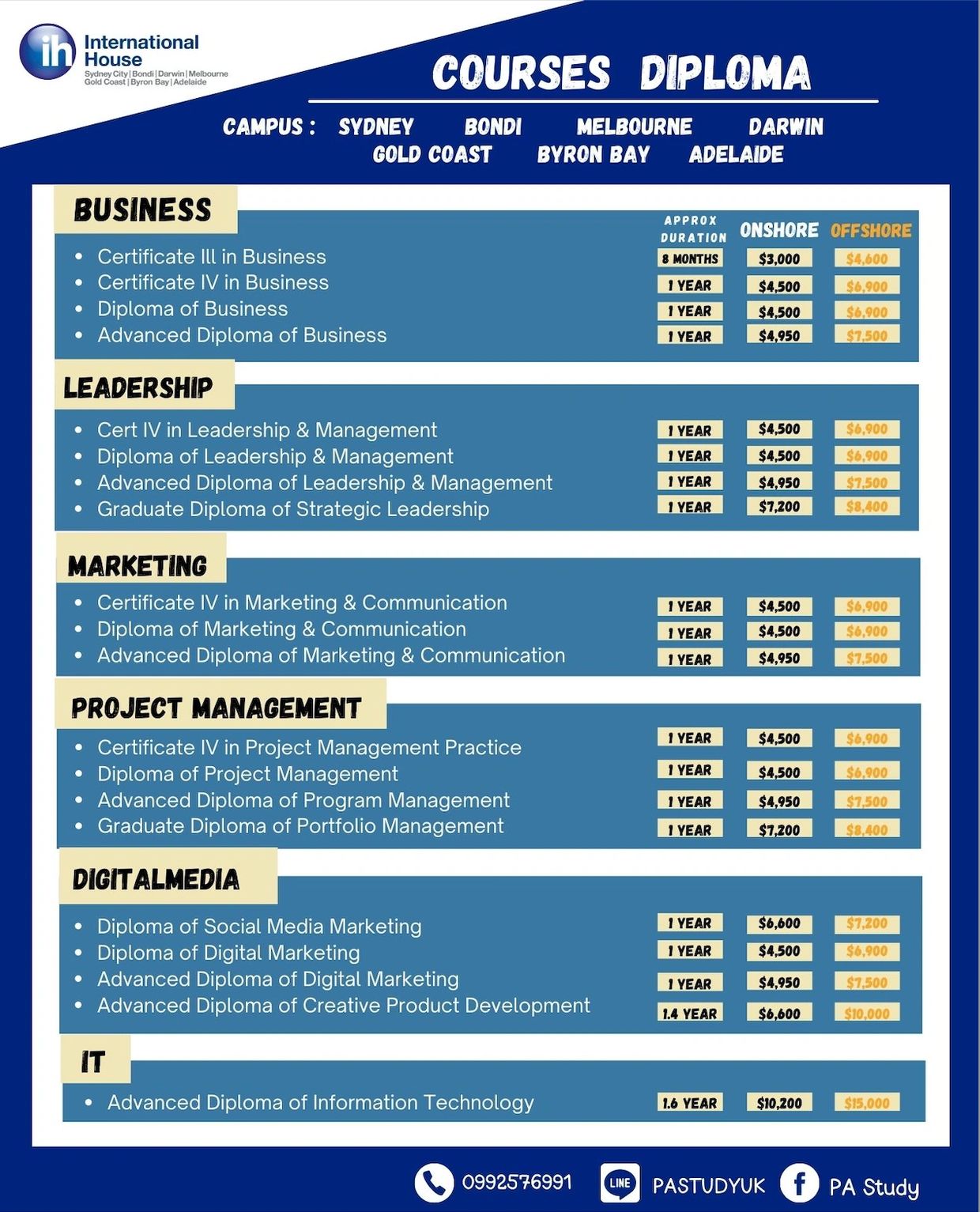 International House (IH) ก่อตั้งขึ้นในปี 1997 เป็นโรงเรียนสอนภาษาอังกฤษชั้นนำที่เก่าแก่ที่สุดใน ออสเตรเลีย เป็นส่วนหนึ่งของโรงเรียนในกลุ่ม International House World Organisation (IHWO) ซึ่งบริหารโรงเรียนสอนภาษาอังกฤษและวิทยาลัย กว่า 150 แห่ง ใน 50 ประเทศทั่วโลก IH มีหลักสูตรภาษาอังกฤษมากมายให้นักเรียนได้เลือกให้เหมาะกับความต้องการของตน และคอร์สเรียนภาษายังสามารถเลือกเรียนได้ในหลากหลายแคมปัสที่ตั้งอยู่ในเมืองสำคัญของออสเตรเลีย เช่น ซิดนีย์,บอนได,ดาร์วิน,เมลเบิร์น,โกลด์โคสต์ และ ไบรอน เบย์ ซึ่งแต่ละเมืองมีความแตกต่างกันไป